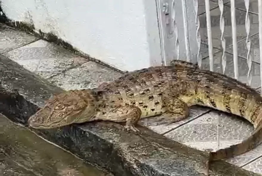 Jacaré aparece na calçada após fortes chuvas e assusta moradores de Barreiros, Zona da Mata de PE