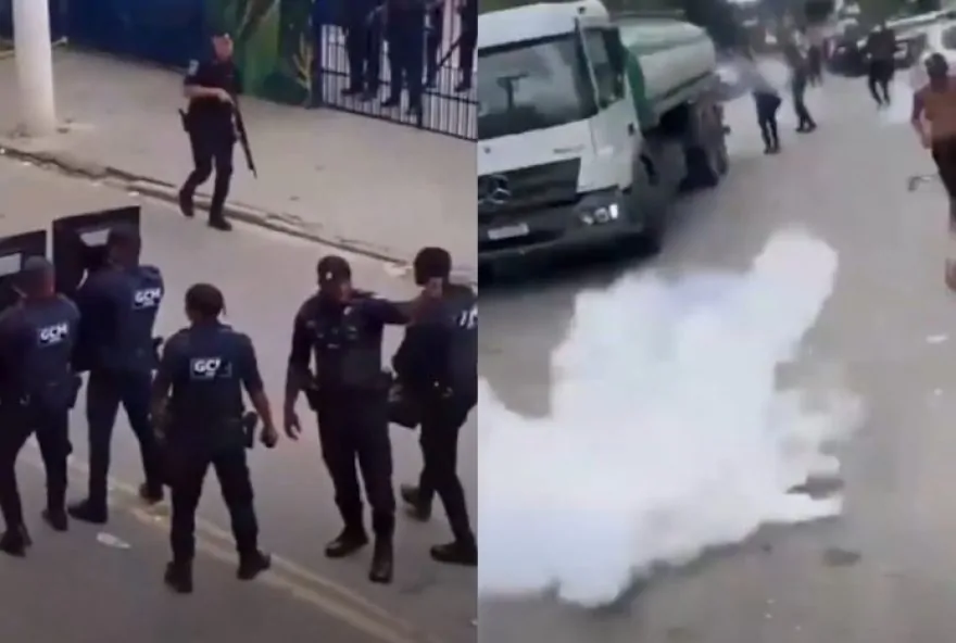 A notícia provocou uma confusão. Testemunhas registraram o momento em que guardas municipais fazem disparos de bombas de efeito moral contra os moradores — alguns deles reagem atacando pedras (veja acima). As imagens foram publicadas pelo perfil Jardim Helena ZL.