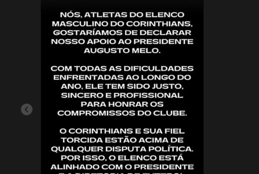 Alinhados com a diretoria de futebol, os jogadores destacaram a importância de deixar as disputas políticas de lado em prol do Corinthians e de sua torcida. O elenco profissional masculino ressaltou a confiança no presidente Augusto Melo, em um momento em que o clube busca retomar o caminho das vitórias e conquistas. A postagem conjunta dos jogadores foi uma forma de mostrar que estão unidos e focados em seguir em frente, independentemente dos desafios que possam surgir no cenário político interno do clube.