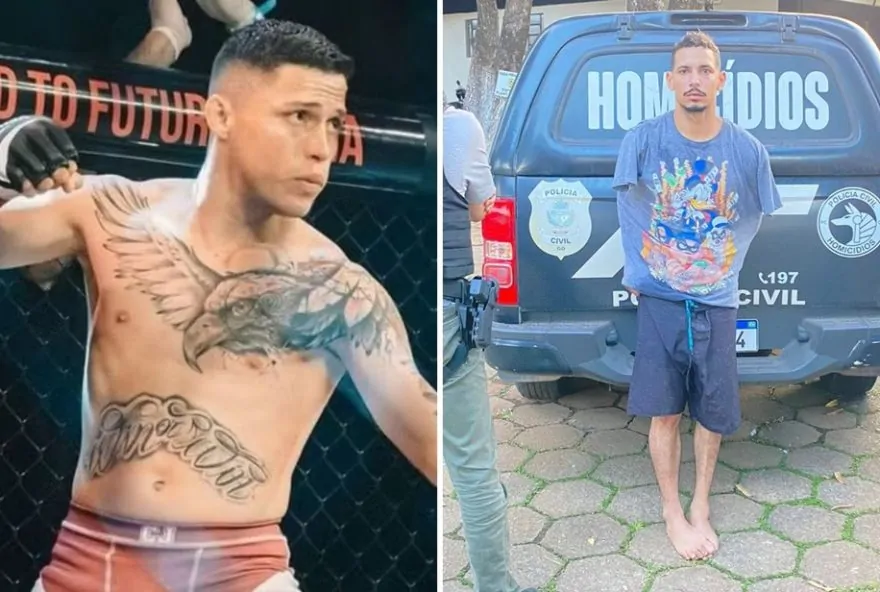 Leandro Marcos Gomes Pereira (à direita), preso suspeito de matar o lutador de MMA e empresário Paulo Henrique Rodrigues (à esquerda), em Goiânia, — Foto: Montagem/de