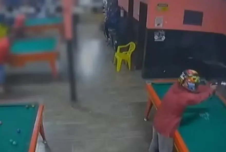 Nas imagens é possível ver o momento em que o suspeito – vestido com camisa vermelha, calça clara, chinelos e capacete – entra no local e atira contra a vítima, que jogava sinuca em uma mesa ao lado da entrada. O atirador dispara diversas vezes contra a vítima, que chega a bater o taco de sinuca contra a arma.