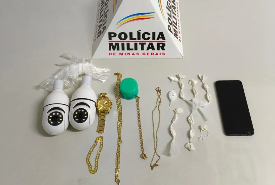 Diante do histórico criminal do suspeito e da possibilidade de haver arma de fogo na casa, a polícia foi até o imóvel. Durante buscas, foram encontrados 18 invólucros de cocaína, ácido bórico, plásticos para embalo, joias, um celular e duas câmeras de monitoramento, possivelmente usadas para vigiar a movimentação na área e prevenir ações policiais.