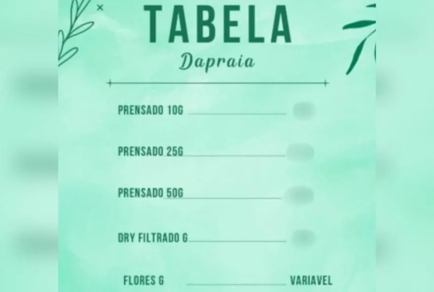 As investigações concluíram que o jovem vendia as drogas online e expunha as espécies de maconha com quantidade e preço em um menu, que chamava de “tabela da praia”, em alusão ao apelido. O suspeito ainda exibia os tijolos de maconha em fotos.