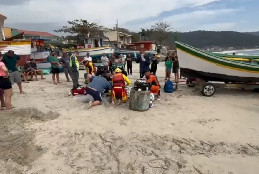 Um jovem de 23 anos teve o rosto esmagado por um barco enquanto manuseava a embarcação na praia de Armação, em Florianópolis, mobilizando uma grande operação de socorro. De acordo com informações dos bombeiros, o barco estava suspenso em uma espécie de macaco e, quando o jovem pegou uma ferramenta embaixo da estrutura, ela acabou caindo sobre ele. A vítima foi prontamente atendida, entubada e levada ao hospital de helicóptero para receber tratamento emergencial.
