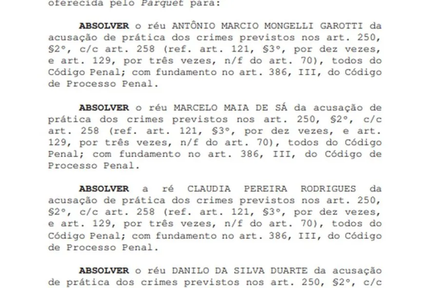 Os réus, incluindo Márcio Garotti, ex-diretor financeiro do Flamengo, Marcelo Maia de Sá, diretor adjunto de patrimônio, e vários engenheiros responsáveis técnicos, foram absolvidos da acusação. Após a primeira audiência em agosto de 2023, várias testemunhas foram ouvidas, incluindo ex-membros da diretoria do clube. As audiências subsequentes continuaram a buscar a verdade sobre a tragédia que resultou na perda de jovens talentosos.