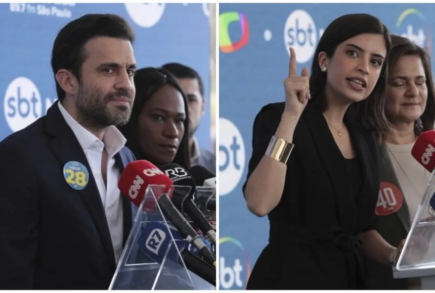 Os candidatos Pablo Marçal (PRTB) e Tabata Amaral (PSB) durante coletiva de imprensa em 20 de setembro de 2024.