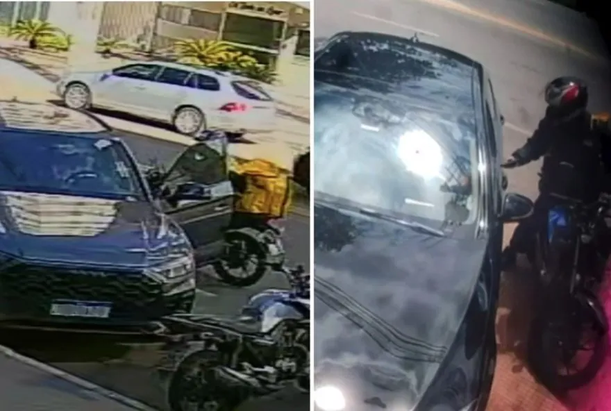 Os crimes ocorreram com duas horas de diferença na tarde da última sexta-feira (16) e foram capturados por câmeras de segurança. Nas imagens, o motociclista estava utilizando uma motocicleta e um equipamento de entregador, que aparentam ser os mesmos.
