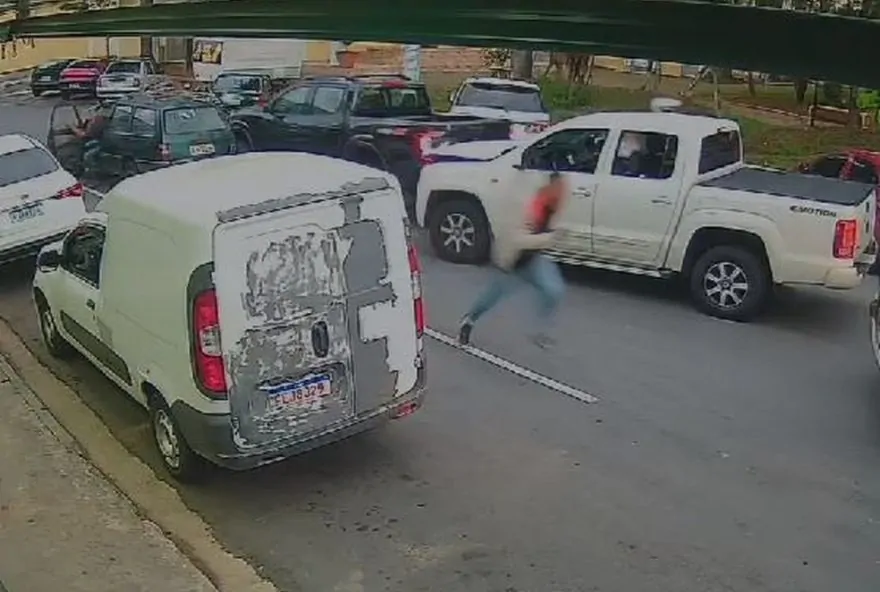 Nas imagens, é possível ver o momento em que as motos se aproximam. O ladrão dá marcha à ré e bate a traseira na frente de outra caminhonete, uma Volkswagen Amarok branca.