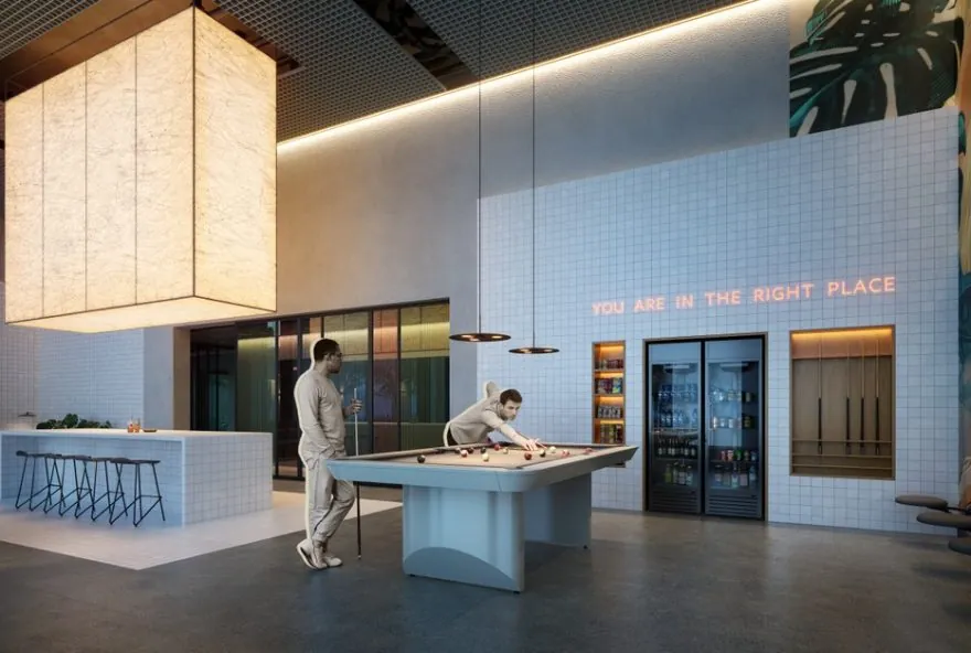 No lobby, ser recepcionado por uma bancada, geladeiras e mesa de sinuca já dá o tom descontraído do encontro. Essa mesma filosofia permeia áreas como o Pool Lounge e o Gourmet, pensados para integração. Outro destaque é o WorkBar, um espaço dinâmico que funciona como coworking durante o dia e vira cenário para o happy hour à noite, com cervejeira, churrasqueira e conexão direta ao Game Room, uma sala de jogos vibrante, inspirada no icônico jogo tetris (referência também presente na fachada) que simboliza modularidade e adaptabilidade.