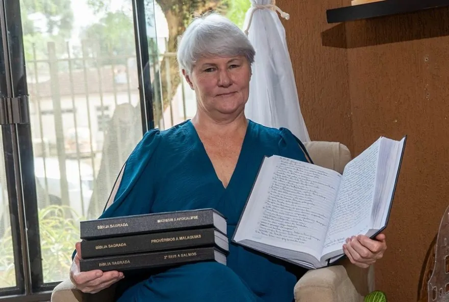 A paranaense Eliana Selmer copiou a Bíblia inteira à mão duas vezes, presenteou os dois filhos com os manuscritos e inspirou uma transcrição coletiva na igreja que frequenta, a Adventista Central de Castro, na região dos Campos Gerais do Paraná.