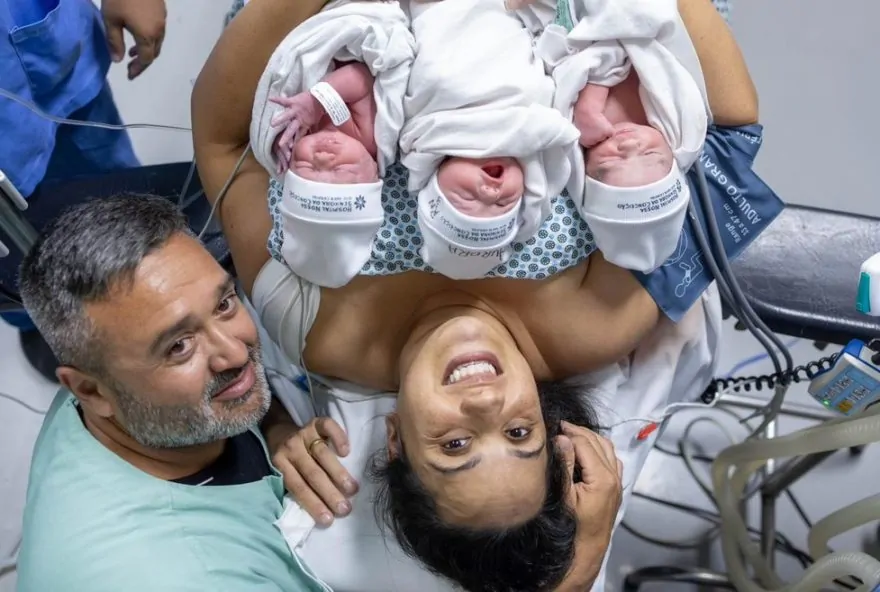 Graziela Cândido, de 36 anos, viveu um momento inesquecível na terça-feira (4). Mãe dos gêmeos Vitor e Vicente, de 8 anos, e de Ana Julia, 6 anos, ela deu à luz trigêmeas no Hospital Nossa Senhora da Conceição, em Tubarão, no Sul de Santa Catarina. A gestação é considerada rara e pode estar relacionada a fatores genéticos, idade e maior tendência à ovulação múltipla (entenda mais abaixo).