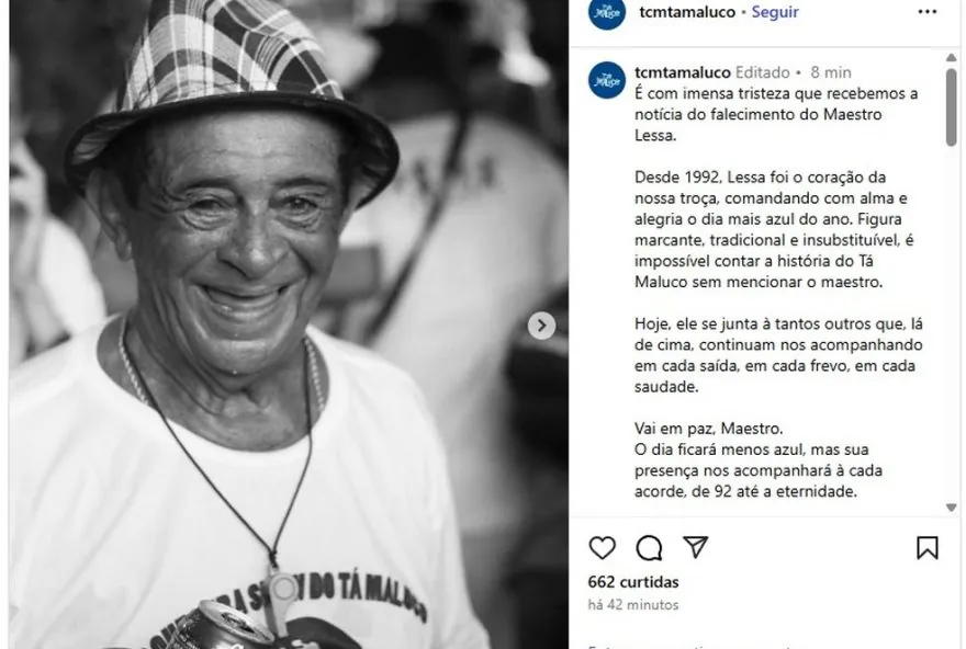 Post da Troça Carnavalesca Mista Tá Maluco sobre a morte do Maestro Lessa —