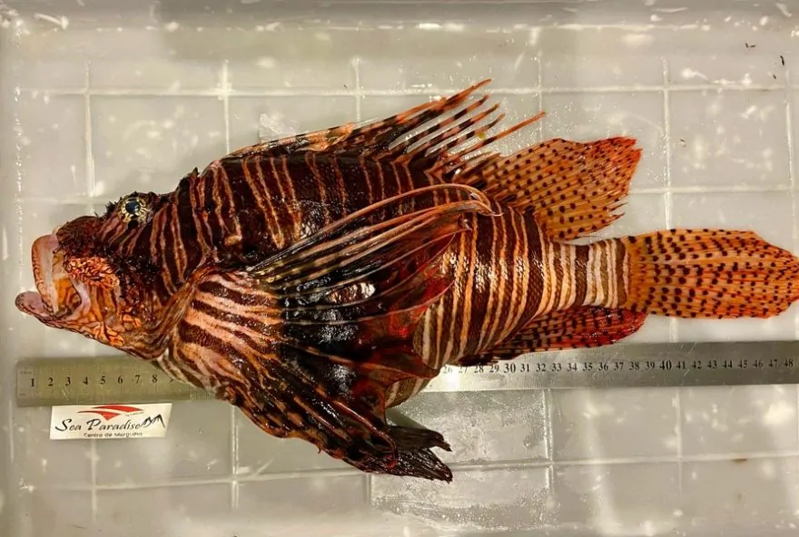 Peixe-leão capturado mede 49 centímetros — Foto: Sea Paradise/Divulgação
