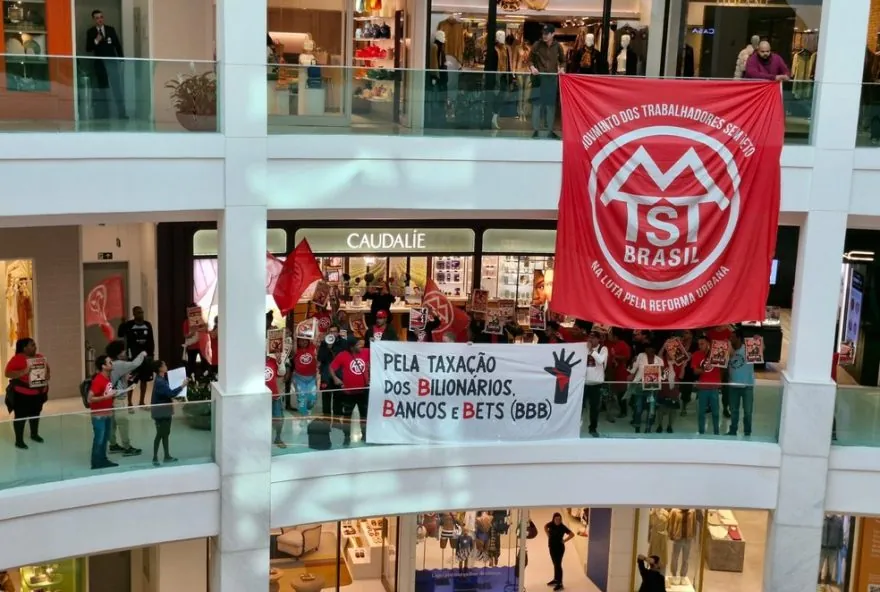 Os manifestantes ocuparam os corredores do shopping, exibindo faixas e cartazes com mensagens em defesa da taxação de bilionários, bancos e casas de apostas. A proposta do Movimento dos Trabalhadores Sem Teto é pressionar o governo federal e o Congresso Nacional a adotarem medidas que promovam uma maior justiça fiscal no país.