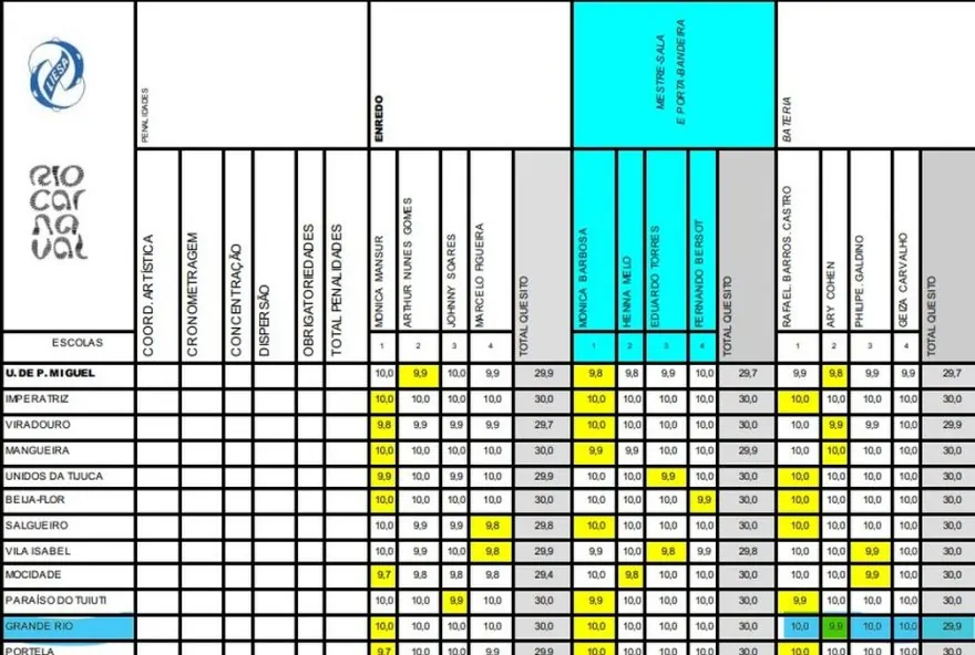 Na tabela, havia três notas 10 e uma 9.9 – diferente do que foi lido pelo locutor Jorge Perlingero na Cidade do Samba, dois 9.9 e dois 10. A diferença foi na nota da jurada Geiza Carvalho. Como a nota mais baixa é descartada, se a escola levasse só um 9.9, ele não seria computado. Com isso, a Grande Rio somaria 30 pontos no quesito e dividiria o título com a Beija-Flor.