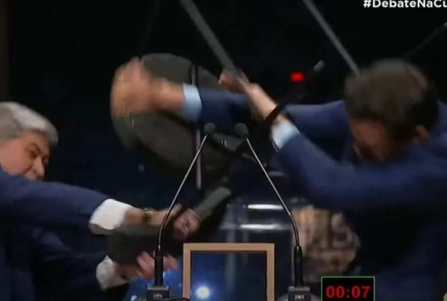 Em sequência, Datena agrediu Pablo Marçal com uma cadeira. O programa foi interrompido imediatamente.