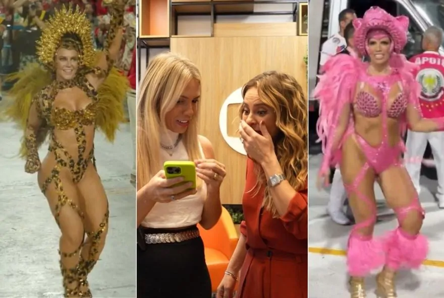 A apresentadora Marcelly Abreu, que se inspirou na ‘onça’ de Paolla Oliveira, encontrou a atriz nos Estúdios Globo. Marcelly, rainha influencer da União Imperial, usou uma fantasia que abria e fechava a máscara por meio de um botão escondido no figurino, o mesmo mecanismo usado por Paolla Oliveira como rainha de bateria da Grande Rio em 2024.