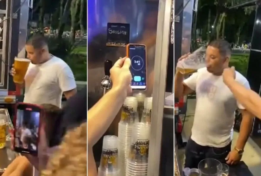 O desafio foi proposto a Wanderson por um amigo que, inclusive, falhou na mesma missão momentos antes. O colega conseguiu beber apenas um litro de chope em quatro minutos.