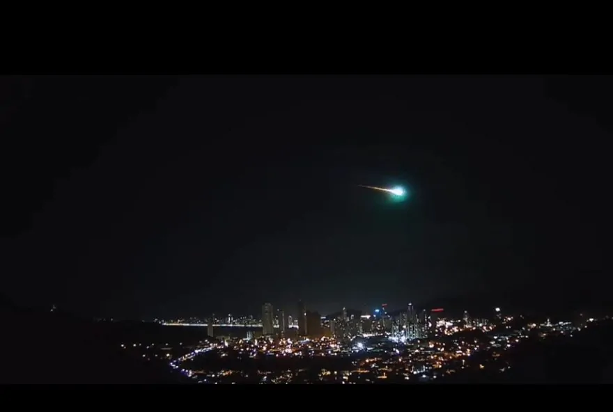 Uma câmera panorâmica em um morro de Itapema, no Litoral Norte de Santa Catarina, mostrou um novo ângulo da passagem de uma fenômeno com cor esverdeada que cruzou os céus do estado na noite de quarta-feira (23). As imagens capturadas pela câmera revelam o meteoro descendo inicialmente em uma cor mais clara, tornando-se mais verde à medida que percorre o céu e, por fim, explodindo e desaparecendo na escuridão da noite.
