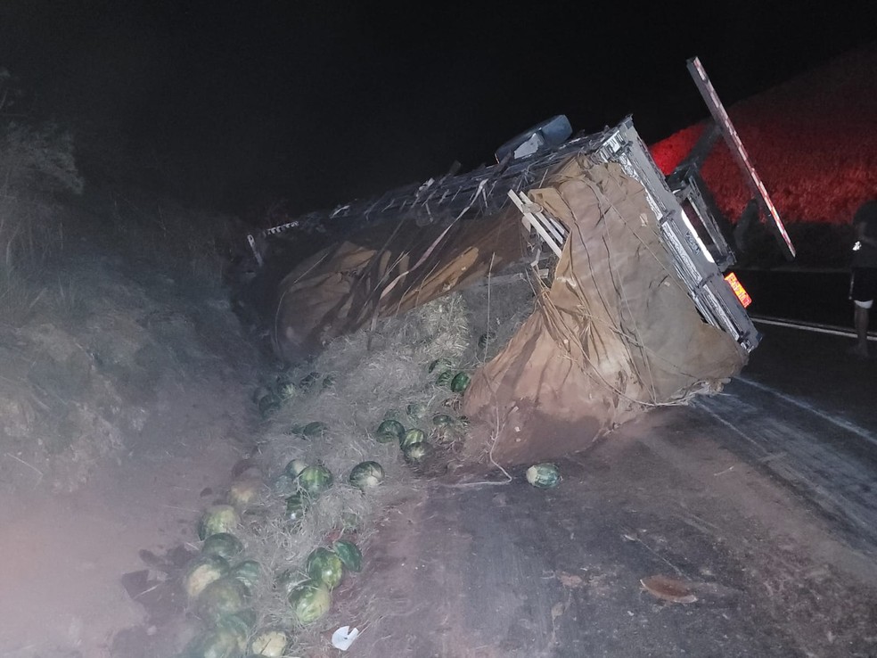Caminhão com 14 toneladas de melancia tomba na BR-251 em Francisco Sá: motorista ileso e pista interditada