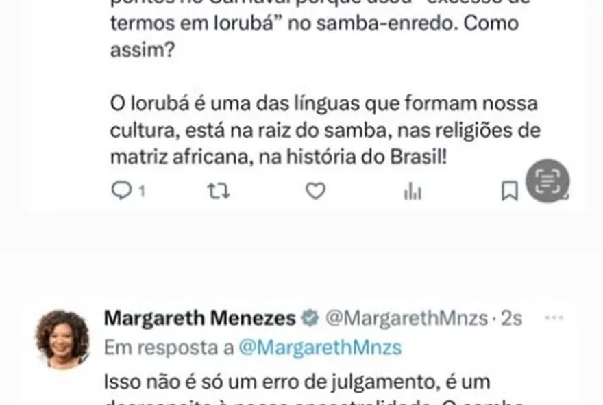 A Ministra da Cultura, Margareth Menezes, criticou o argumento do juiz da Liesa que resultou na perda de ponto da Unidos de Padre Miguel por ‘excesso de termos em Iorubá’. Segundo ela, essa penalização é um desrespeito à nossa ancestralidade e à cultura afro-brasileira, que tem o Iorubá como uma das línguas fundamentais. A crítica foi feita nas redes sociais da ministra, em apoio à escola de samba.