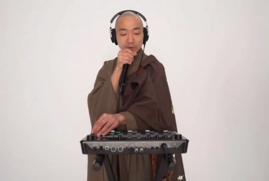 Um DJ sul-coreano, com a cabeça raspada e trajes de monge, canta escrituras budistas tradicionais combinadas com conselhos de vida para a Geração Z, ao ritmo de música eletrônica, enquanto a multidão delira de êxtase.