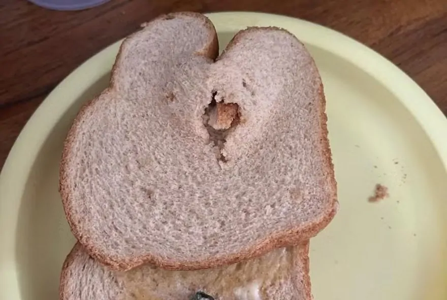 “Abri a embalagem para fazer uma torrada para o nosso filho de 1 ano. Percebi que a primeira fatia abaixo da capa do pão estava bastante amassada e peguei a segunda fatia. Quando fui passar manteiga, reparei que uma parte da fatia estava esverdeada. Fui conferir mais de perto e percebi que tinha um objeto ali e encontrei o projétil”, contou a cliente ao g1.