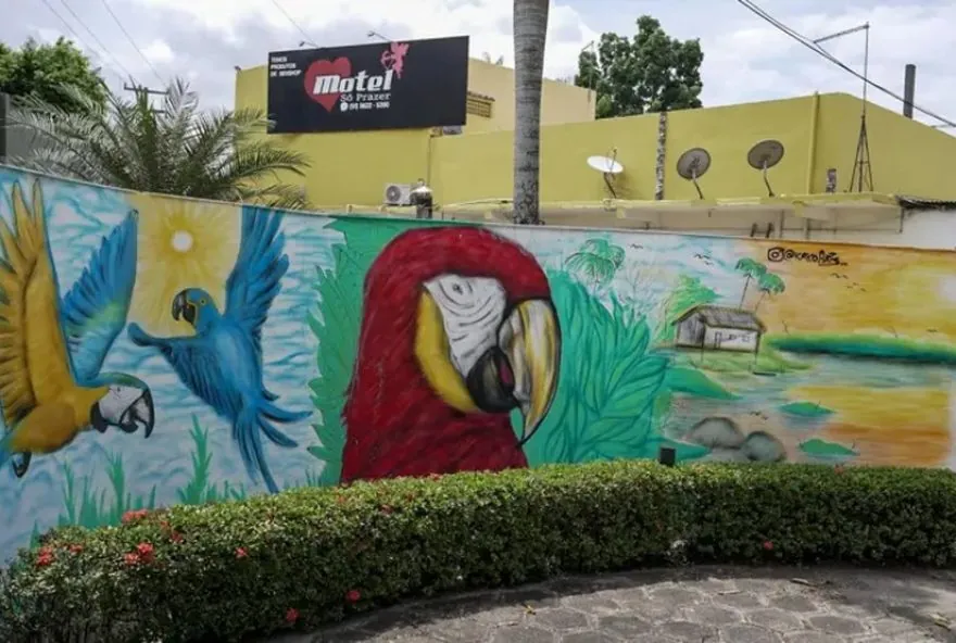 O motel ‘Só Prazer’ recebe agora seus hóspedes com pinturas que remetem à fauna amazônica, como se fosse uma pousada no meio da floresta. Antes de chegarem às garagens escondidas atrás de cortinas, os visitantes se deparam com araras, onças e tucanos pintados no muro.
