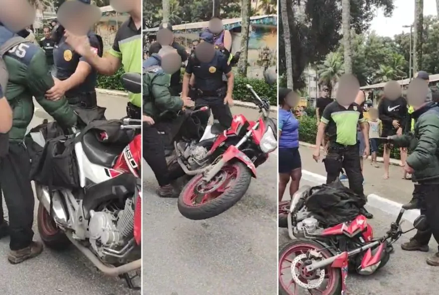 Uma cena inusitada marcou uma blitz realizada em São Vicente, no litoral de São Paulo, quando um motociclista decidiu derrubar a própria moto após esta ser guinchada por irregularidades na placa. O momento da confusão foi registrado em vídeo, obtido pelo DE. A prefeitura local informou que abriu um processo administrativo para apurar o caso, enquanto a Polícia Civil registrou um boletim de ocorrência por desacato.