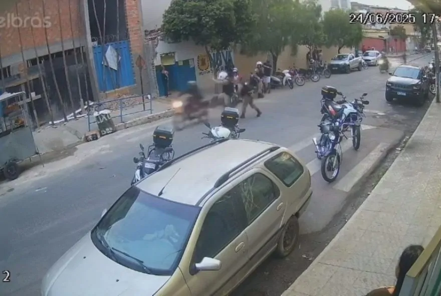 É possível ver um dos policiais sinalizando para que ele pare, mas o jovem ignora a ordem e segue com a moto. Outro policial, que assistia à cena, se aproxima e quase é atropelado. Ele consegue chutar a moto, fazendo com que o condutor perca o controle, bata em uma barraca e caia no chão.