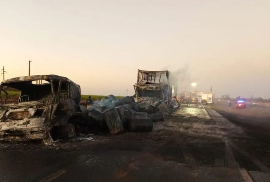 De acordo com os militares, o fogo tomou conta dos dois veículos e da carga do caminhão de trás, mas foi contido pelos bombeiros antes que se espalhasse para outros veículos e por uma plantação de cana-de-açúcar que fica próxima à rodovia.