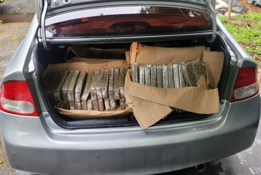 Durante a checagem no carro, foram encontrados diversos tabletes de maconha, que