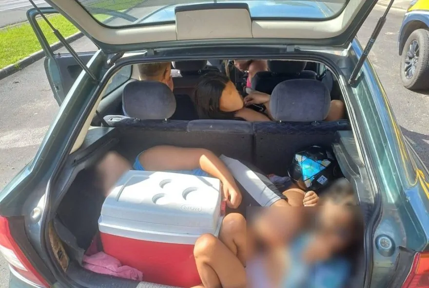 Um motorista foi flagrado transportando os dois filhos no porta-malas de um carro na BR-101 em Paulo Lopes, na Grande Florianópolis, informou a Polícia Rodoviária Federal (PRF). As duas crianças ainda dividiam o espaço apertado com um cooler, sacolas e uma bola.
