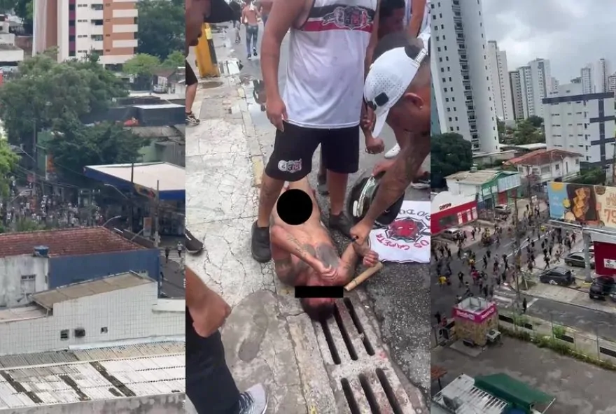 sendo violentamente espancados por torcedores vestidos com roupas do Santa Cruz