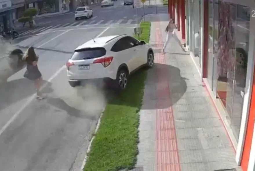 A batida aconteceu por volta das 9h, na Rua Senador Nereu Ramos, no Centro. A mulher que quase foi atingida caminhava perto do veículo parado quando o condutor de uma Montana bateu no Honda/HR-V estacionado. É possível ver que ela se assusta e logo corre para a calçada. Outra pessoa que passava no local também tenta se abrigar perto da fachada de uma loja após o susto.