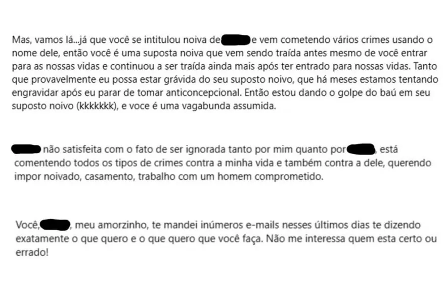 No texto, a suspeita chamou o dentista de “amor” e a noiva dele de “vadia”. Disse que era perseguida pela mulher do dentista, a quem acusou de buscar um relacionamento com um “homem comprometido” e chegou a aconselhá-lo a fazer um boletim de ocorrência contra a própria noiva. Também mencionou estar em um relacionamento com ele há muito tempo e afirmou, na publicação, que tentava engravidar dele. “Estamos tentando engravidar após eu parar de tomar anticoncepcional”.