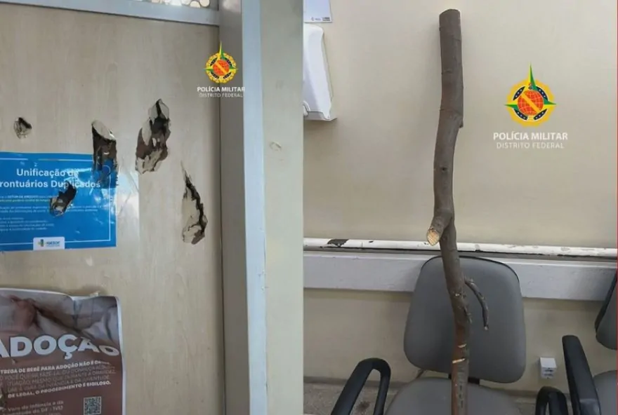 Por falta de atendimento, duas mulheres depredaram um porta da ala de pediatria no Hospital Regional de Santa Maria (HRSM), em Brasília, nesta sexta-feira (23). Com pedaços de árvores, elas fizeram furos em uma das portas do local.