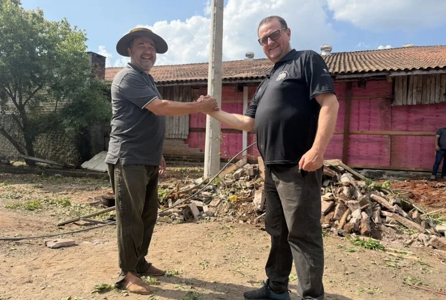 Segundo Vilson, porém, a estrutura não foi comprometida — algo que deverá ser confirmado por um laudo de engenharia. Na foto, ele aparece cumprimentando o ex-patrão Lírio Gomes (à esquerda), que também participou do mutirão para reparar os estragos. O acidente ocorreu quando um caminhão desgovernado desceu a ladeira e atingiu outro caminhão estacionado, que foi arremessado contra a parede lateral da sede da entidade. O motorista ferido foi hospitalizado.
