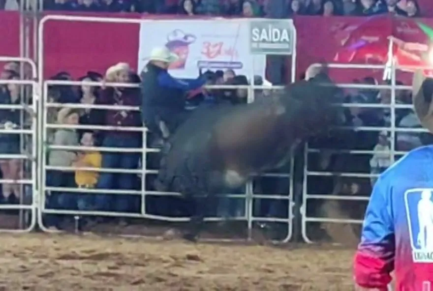 momento em que o touro atinge Xavante, que havia subido em um dos portões ao
