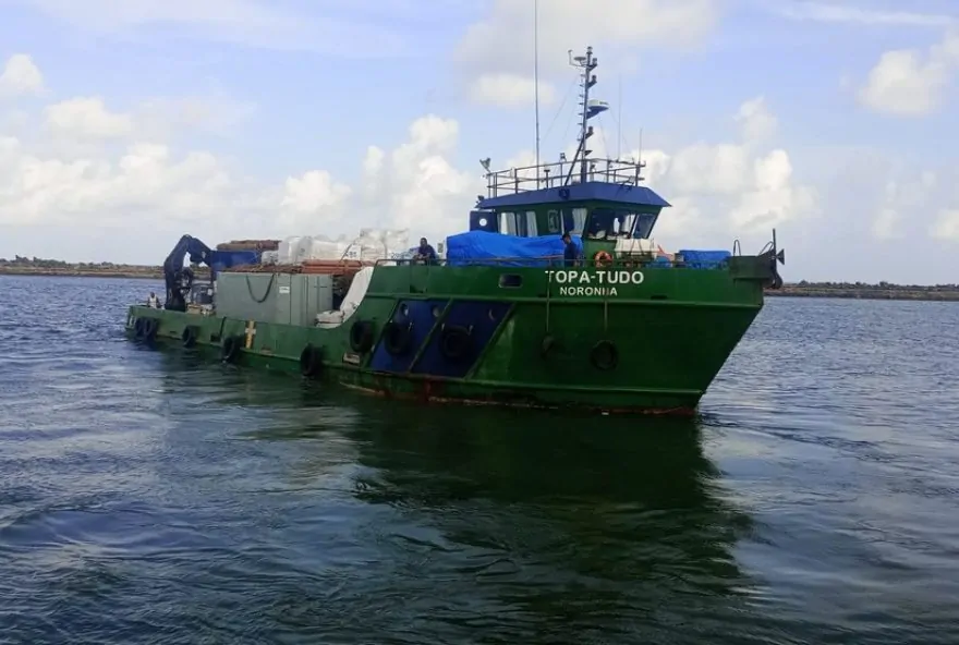 Nas imagens, é possível ver a carga boiando enquanto os tripulantes aguardam, no mar, a chegada da lancha responsável pelo resgate. Os vídeos também mostram os profissionais já embarcados em direção à terra e o navio “Topa Tudo” antes do naufrágio.