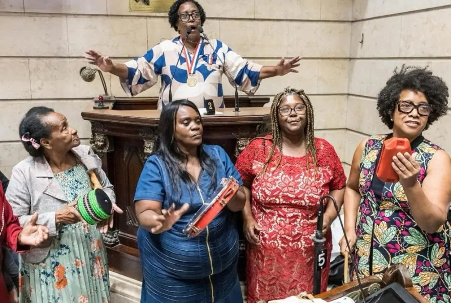 A homenagem prestada a Neia do Surdo não poderia deixar de ter um toque de samba, com uma apresentação que contagiou a todos no plenário e nas escadarias da Câmara Municipal do Rio. O vereador responsável pela entrega da medalha, Inaldo Silva, destacou a importância da condecoração para uma mulher que enfrentou tantas adversidades e conseguiu se destacar positivamente, tornando-se uma referência de superação na cidade do Rio de Janeiro.