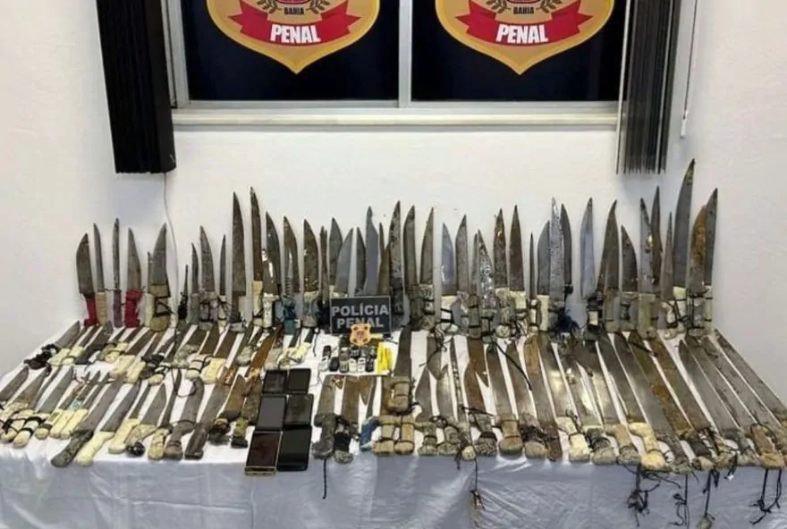Diversos objetos ilícitos foram apreendidos no Conjunto Penal de Eunápolis, no extremo sul da Bahia, nesta semana, em revistas iniciadas após a 16 detentos fugirem da unidade. Entre o material, estão 96 facas e facões, 18 celulares, anotações com contabilidades suspeitas e pendrives.