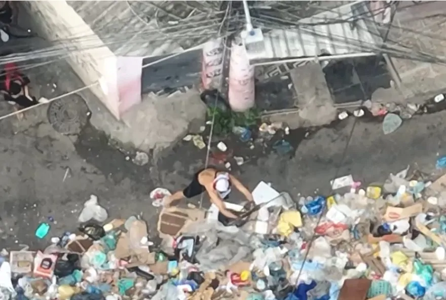 Em outro ponto, em meio a uma montanha de lixo, nove traficantes se revezam