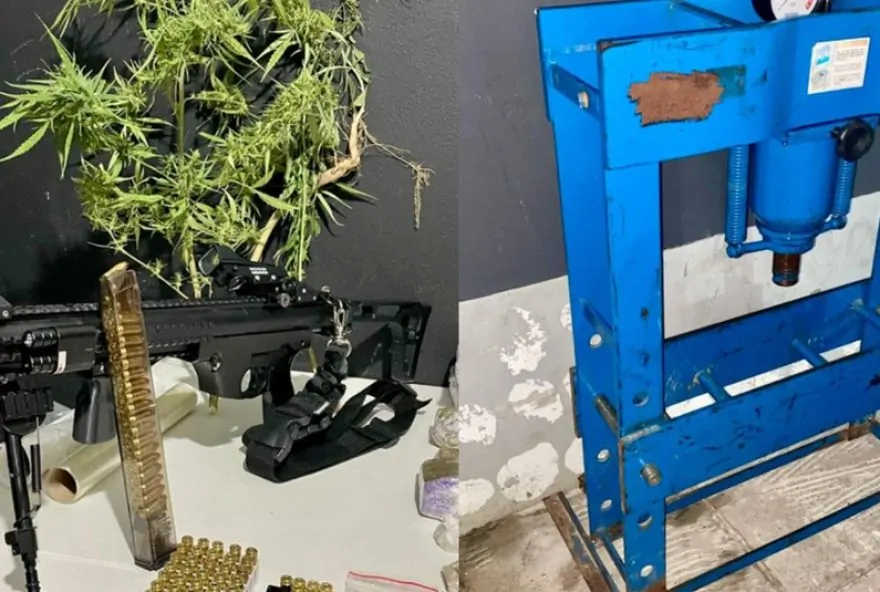 Arma de fogo de uso restrito, munições, veículos, além de drogas e materiais