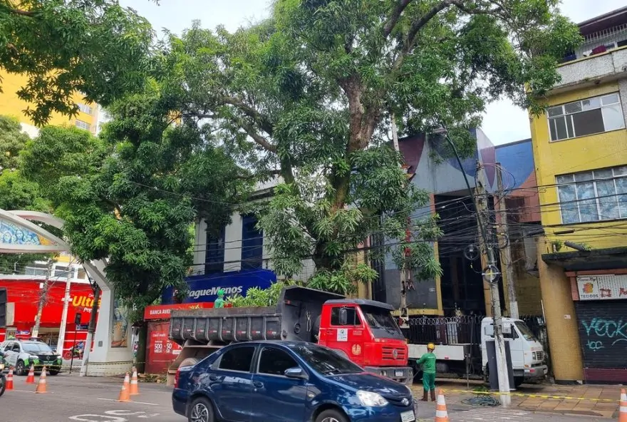 Uma mangueira de grande porte na calçada da avenida Nazaré, em Belém, foi retirada do local por apresentar risco de queda. A remoção ocorreu neste domingo (23) e faz parte da operação da Secretaria de Meio Ambiente e Clima de Belém (Semma) para evitar quedas de árvores na capital.