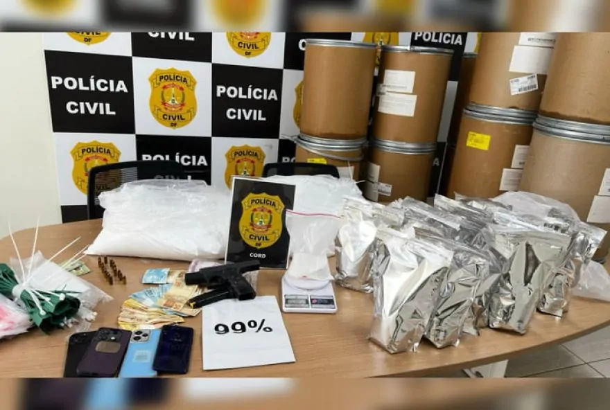 No local, os policiais encontraram uma grande quantidade de substâncias químicas como taurina, tetracaína, fenocaína e cafeína, produtos utilizados para adulterar e aumentar o volume da cocaína. Segundo as investigações, os insumos eram comprados em outro estado e enviados ao DF por meio de plataformas de comércio eletrônico.