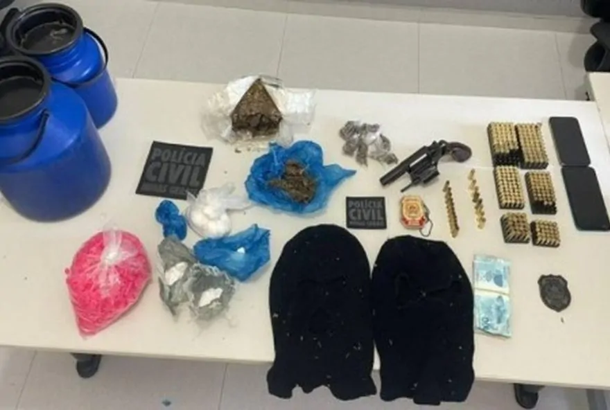 Entre os materiais apreendidos, estão aproximadamente dois quilos de skunk (tipo de maconha com maior potencial entorpecente), meio quilo de cocaína, duas armas de fogo, 244 munições de diferentes calibres, R$ 2 mil em dinheiro falso e R$ 2.172 em espécie, além de quatro veículos e duas balaclavas.