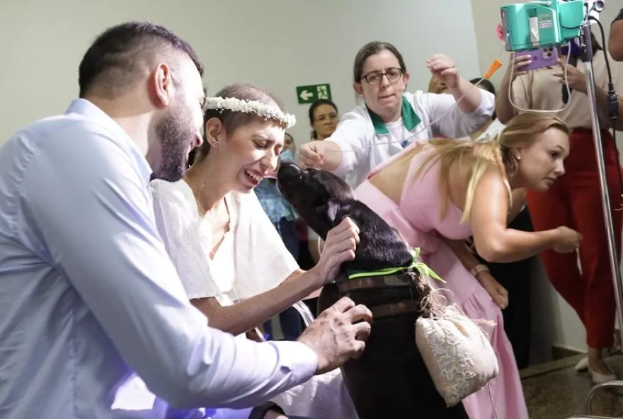 Em outras imagens, o cãozinho aparece carregando as alianças do noivado e se aproximando do casal muito animado, como quem entende a importância e alegria do momento. “O Frank levando as alianças, foi outra surpresa, eu não esperava também, mas era uma parte de um sonho que eu tinha, sempre via nos filmes e sempre achava muito legal. Um dia eu conseguiria fazer isso e aconteceu na surpresa, da melhor forma possível”, contou a paciente.