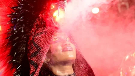 Rainha de Bateria Vanessa Rangeli brilha com fantasia cavada e luzes na estreia da Acadêmicos de Niterói no Grupo Especial 2026