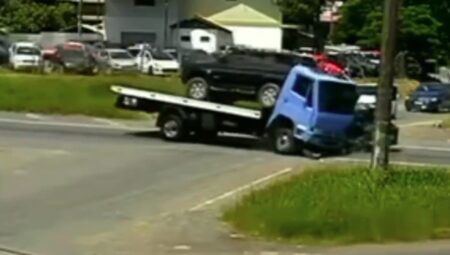 Carro cai de guincho após batida em Blumenau: imagens impressionantes